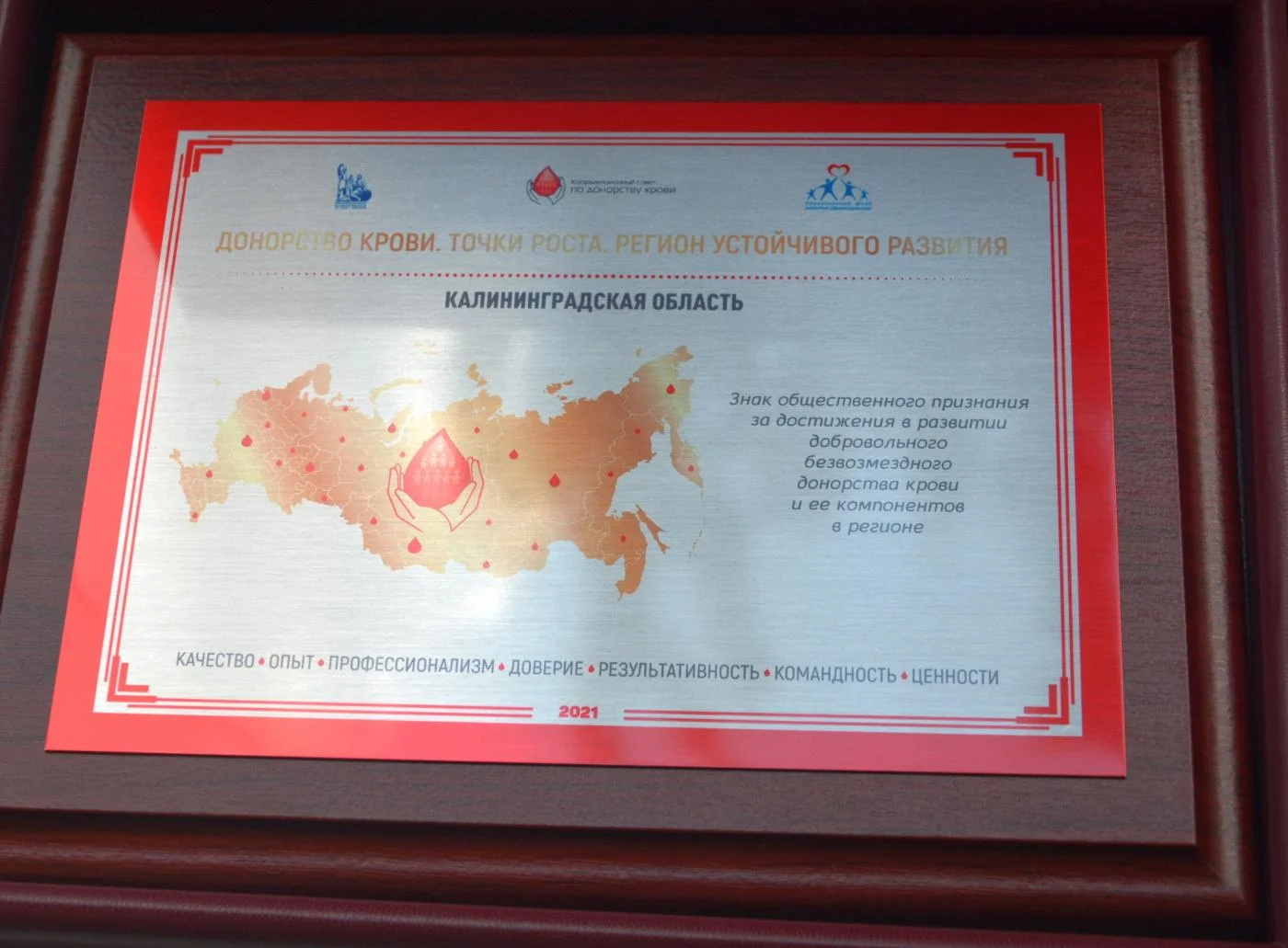 Калининградская область награждена высшей наградой от Общественной палаты Российской Федерации в сфере донорства крови «Знак общественного признания за достижения в развитии добровольного безвозмездного донорства крови и её компонентов в регионе».