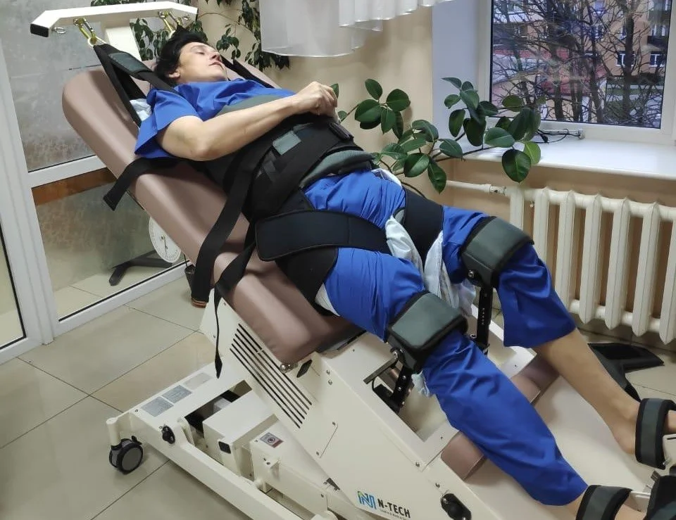 В настоящее время у женщины, поступившей в сосудистый центр с тяжелейшим ишемическим инсультом, уже восстановилась речь, с каждым днем возвращаются двигательные функции, в том числе с помощью специального аппарата – вертикализатора.